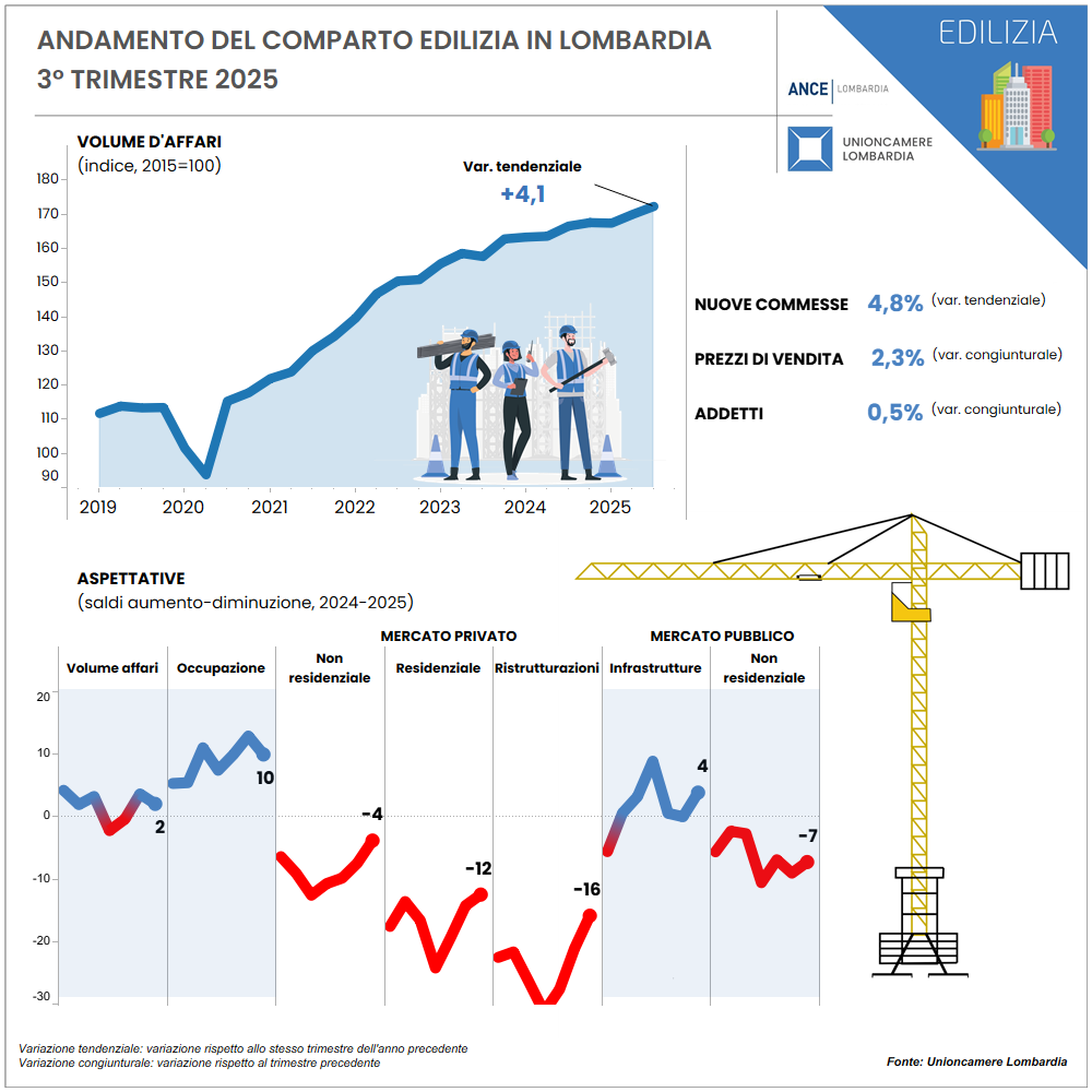 Nel terzo trimestre 2025 prosegue l'aumento del volume d’affari delle imprese lombarde dell’edilizia: la variazione su base annua è infatti pari al +4,1%, in un quadro che si conferma di grande incertezza sul futuro e di crescente eterogeneità, con alcuni mercati in espansione (pubblico, privato non residenziale) e altri dove si riscontra un maggiore pessimismo (residenziale, ristrutturazioni). Le imprese confermano difficoltà di reperimento del personale, ma se le grandi hanno messo in campo strategie specifiche per affrontare il problema (canali digitali di ricerca e selezione, welfare, benefit, percorsi di formazione e crescita) le più piccole spesso non hanno ancora adottato misure di attrazione e retention di competenze e talenti, sebbene si interessino sempre più alle collaborazioni con il sistema formativo.