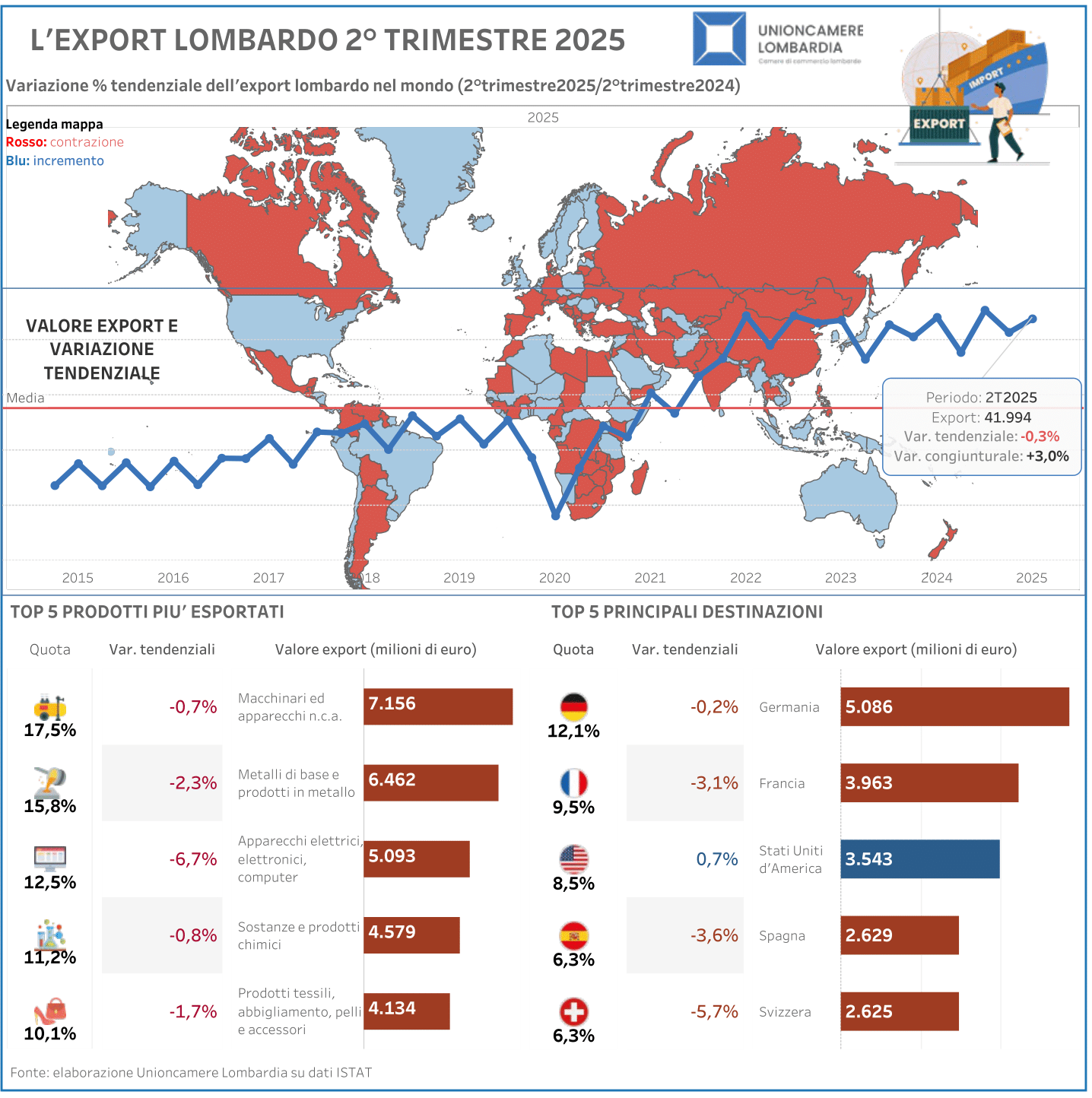 Nel secondo trimestre 2025le esportazioni lombarde si sono attestate a 41,9 miliardi di euro, registrando un calo dello 0,3% rispetto allo stesso periodo del 2024; resta invece positivo il confronto con il trimestre precedente (+3,0%).