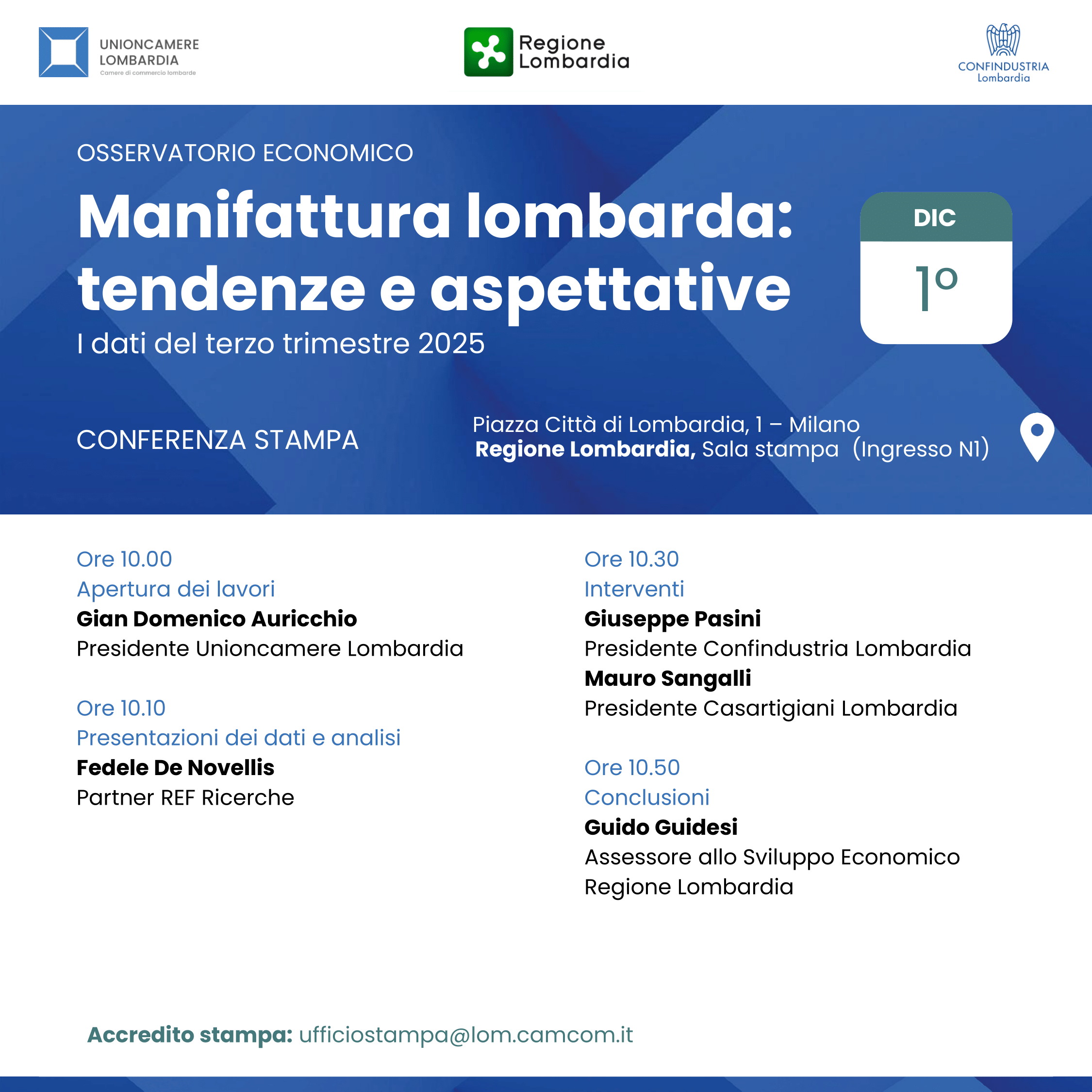 Lunedì 1° dicembre alle ore 10.00 presso la Sala Stampa di Regione Lombardia, si terrà la conferenza stampa sull’analisi congiunturale del terzo trimestre 2025 nel settore manifatturiero. Interverranno Gian Domenico Auricchio Presidente di Unioncamere Lombardia, Giuseppe Pasini, Presidente Confindustria Lombardia, Mauro Sangalli, Presidente Casartigiani Lombardia e Guido Guidesi, Assessore allo Sviluppo Economico Regione Lombardia.
