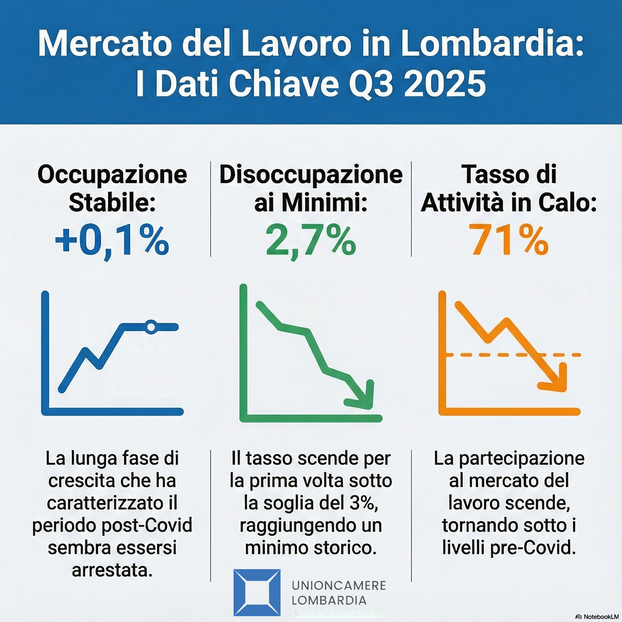 Nel terzo trimestre del 2025 il numero di occupati in Lombardia, dopo una lunga fase di espansione, mostra segnali di stabilizzazione (+0,1% su base annua), per via del rallentamento dei servizi, delle donne e dei dipendenti. La disoccupazione si colloca su livelli storicamente bassi, scendendo per la prima volta sotto la soglia del 3% e attestandosi al 2,7%. Si registra tuttavia anche una diminuzione della partecipazione al mercato del lavoro, con il tasso di attività che scende al 71%. Segnali positivi arrivano dalla Cassa Integrazione, con una riduzione delle ore approvate pari al 19,8%.