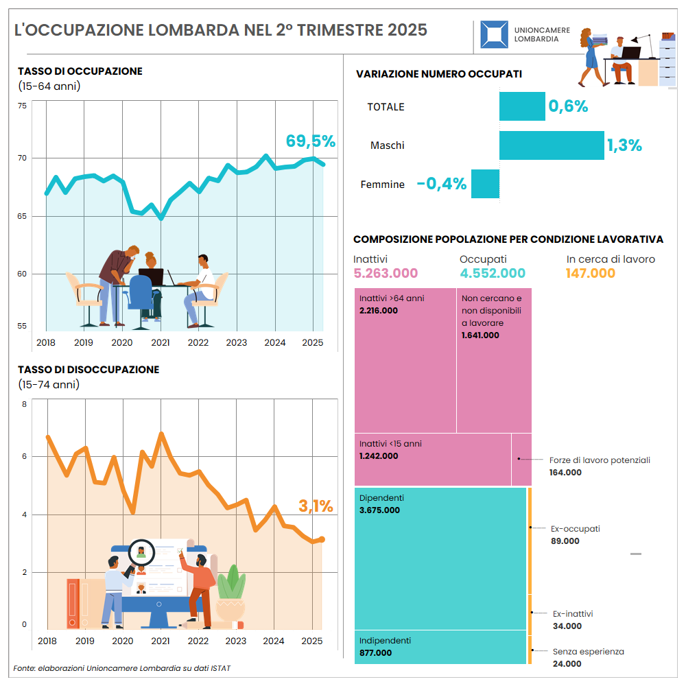Ancora in crescita l'occupazione lombarda nel secondo trimestre 2025 (+0,6%), sebbene in misura meno intensa rispetto ai trimestri scorsi. La disoccupazione continua a diminuire (tasso pari a 3,1%), ma solo per gli uomini si traduce in un aumento di occupazione: l'area dell'inattività, ovvero di chi non lavora né cerca un'occupazione, risulta in lieve espansione rispetto ai livelli pre-Covid. Segnali di attenzione provengono inoltre dalla Cassa Integrazione (+15,8% le ore autorizzate su base annua) e dalle previsioni di assunzione delle imprese, in raffreddamento ad agosto e settembre.