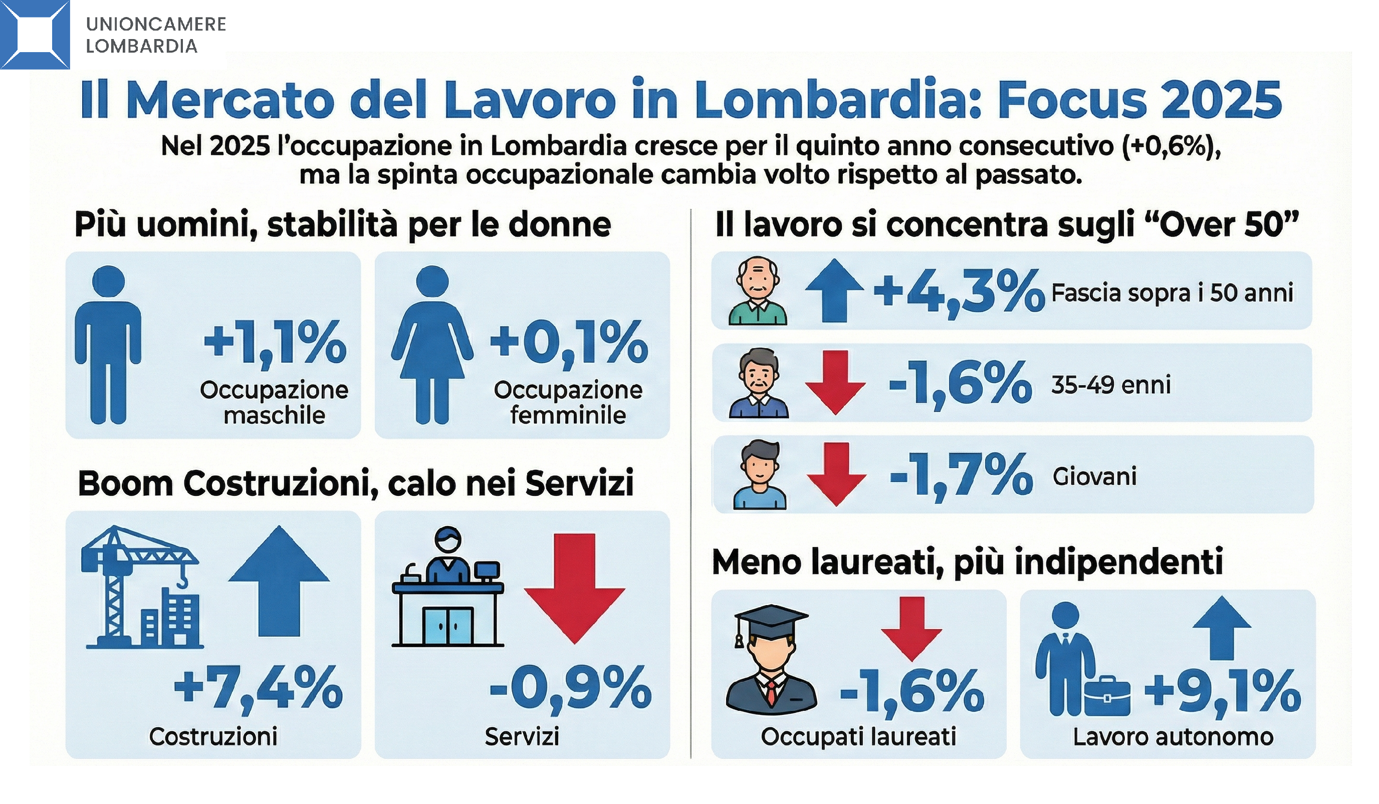 Nel 2025 l’occupazione in Lombardia aumenta per il quinto anno consecutivo, registrando un incremento (+0,6%) in linea con il dato nazionale (+0,8%). La dinamica è risultata più vivace nella prima parte dell’anno, mentre ha evidenziato un rallentamento nella seconda metà (+0,3% nel quarto trimestre). La crescita mostra caratteristiche parzialmente diverse rispetto agli anni precedenti: si arresta l’espansione dell’occupazione femminile (+0,1%) e nei servizi (-0,9%), mentre crescono gli uomini (+1,1%), le costruzioni (+7,4%) e il commercio (+1,6%); diminuiscono giovani (-1,7%) e laureati (-1,6%), con l’incremento concentrato tra gli over 50 (+4,3%). Riprende il lavoro indipendente (+9,1%) e prosegue il calo dei lavoratori part-time (-3,9%).